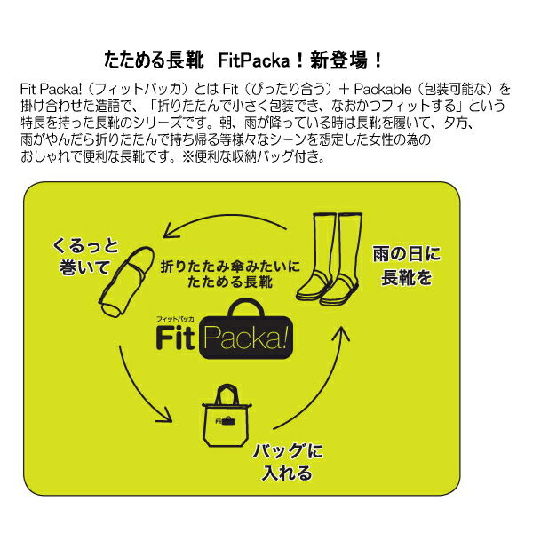 たためる長靴 FitPacka!新登場! FitPacka!(フィットパッカ)とは Fit(ぴったり合う)+ Packable(包装可能な)を掛け合わせた造語で、「折りたたんで小さく放送でき、なおかつフィットする」という特長を持った長靴のシリーズです。